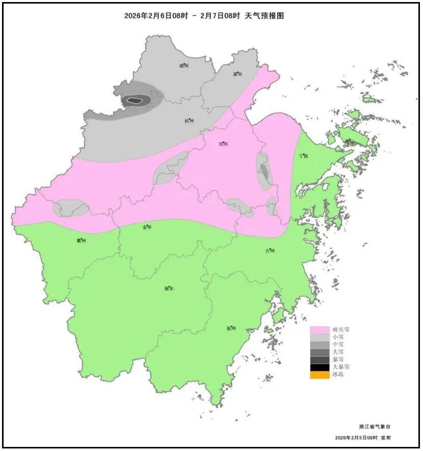 雨(雪)预报:明天(6日)降水较明显,浙北地区部分中雨局部大雨。明天中午起自北而南有一次雨雪转换过程。浙北山区率先转雨夹雪或雪,部分中到大雪,高山区局部暴雪;下午起浙北部分平原地区有雨夹雪,傍晚起雨夹雪或雪;夜里至7日早晨浙中地区和浙南山区部分雨转雨夹雪或雪,其中浙西南山区局部有冻雨。7日中午全省雨(雪)止。