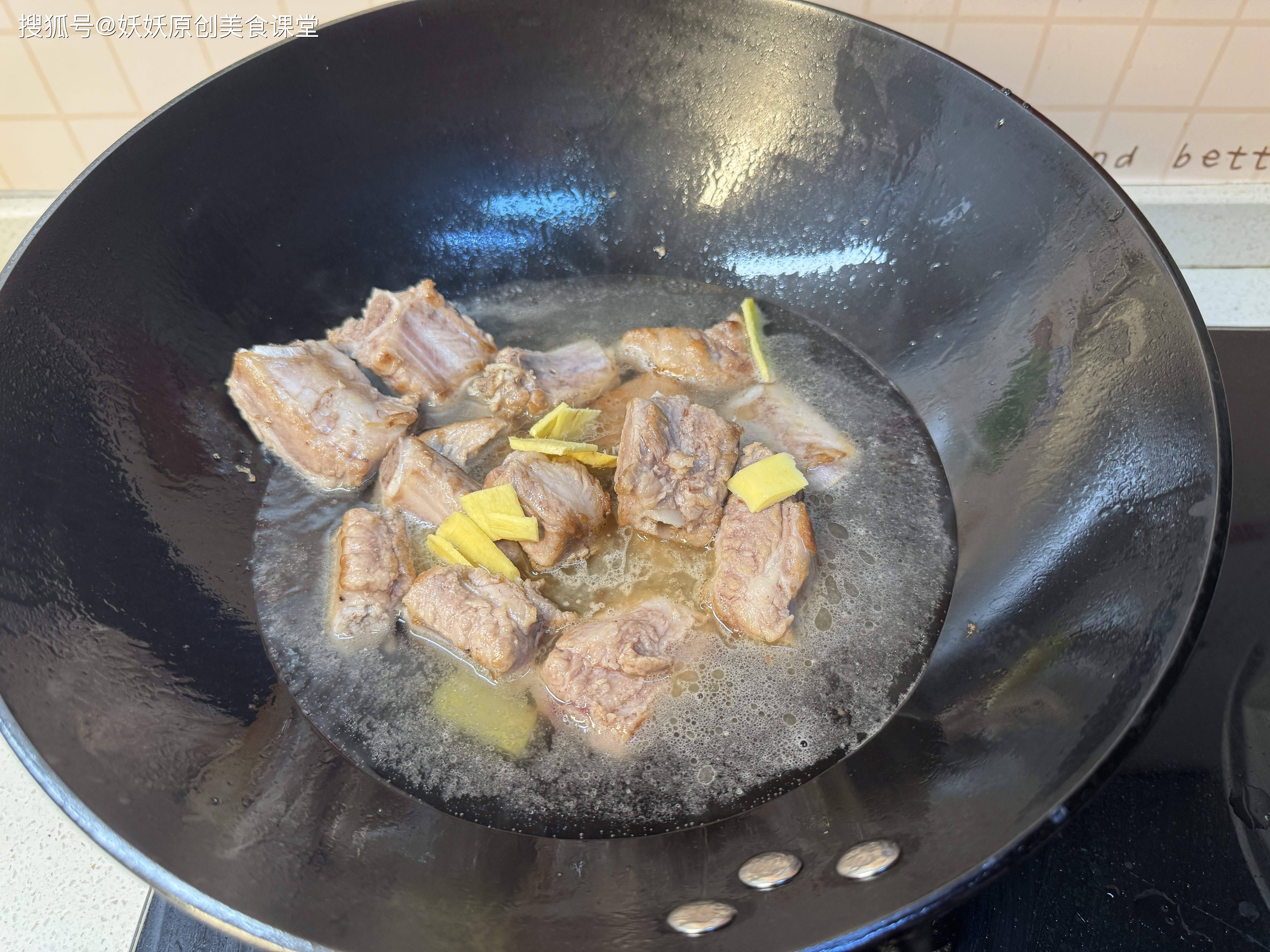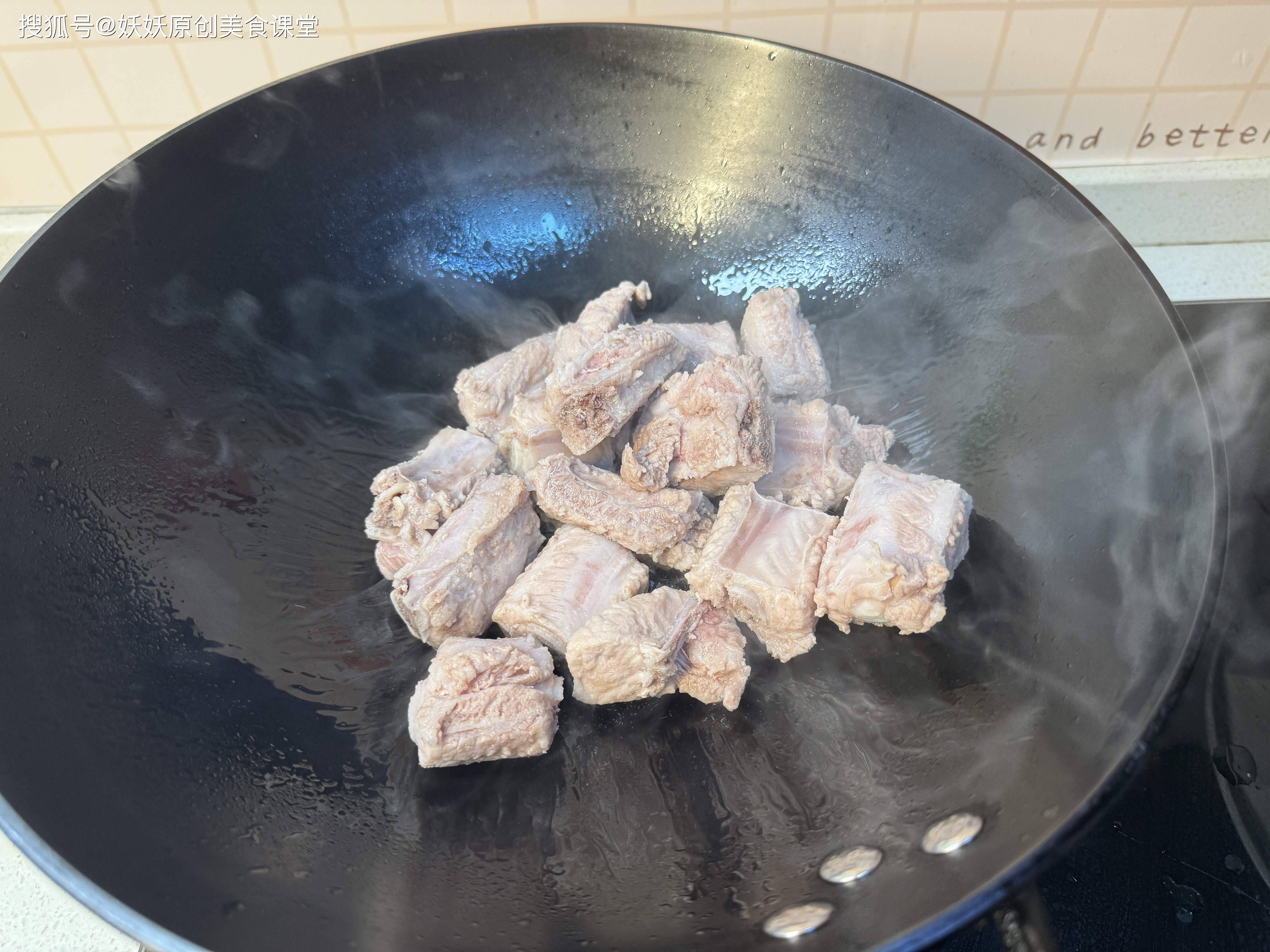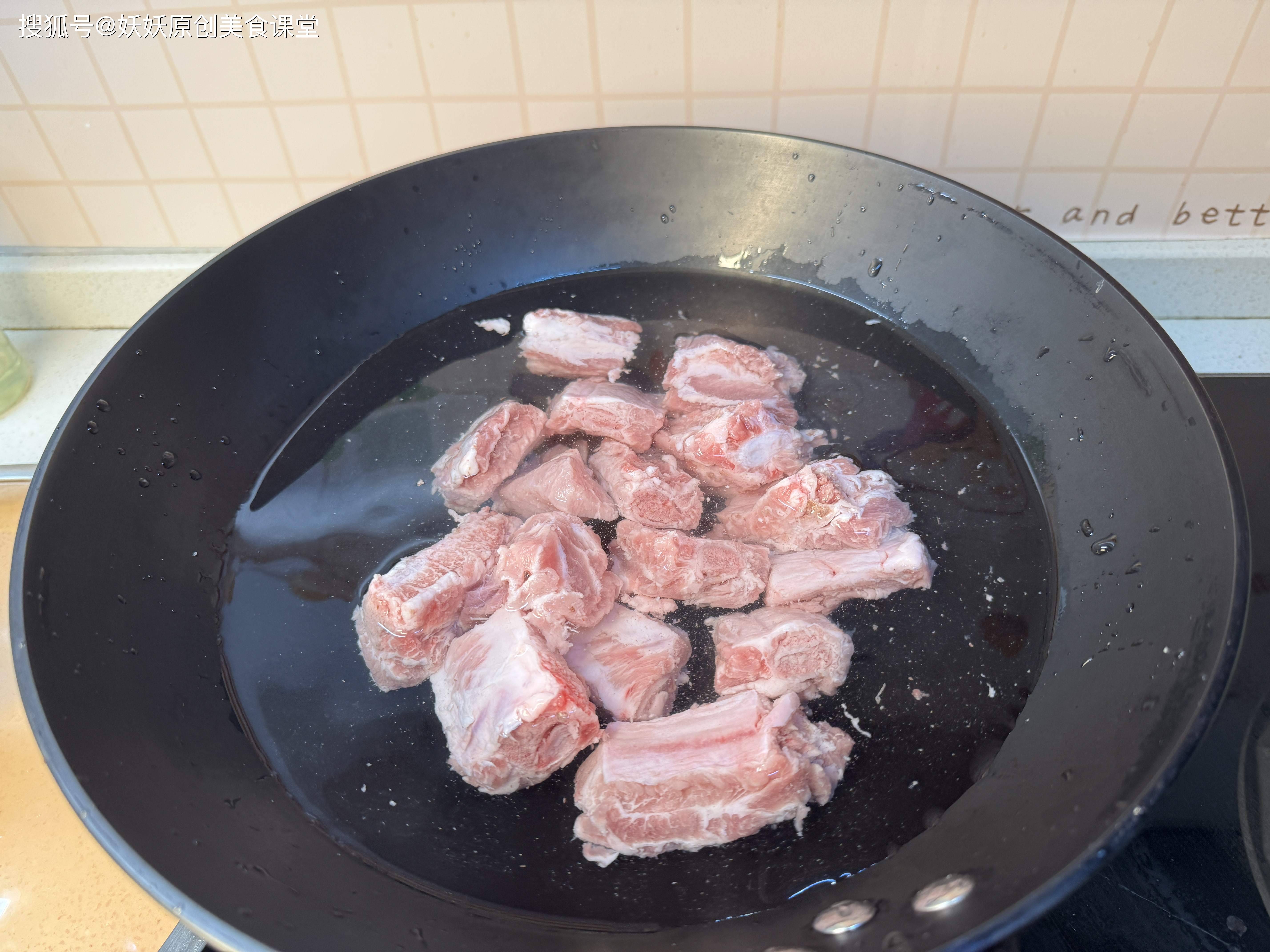 排骨冷水下锅煮至水开关火,捞出冲洗干净血水,用厨房纸巾擦干表面的水分备用。