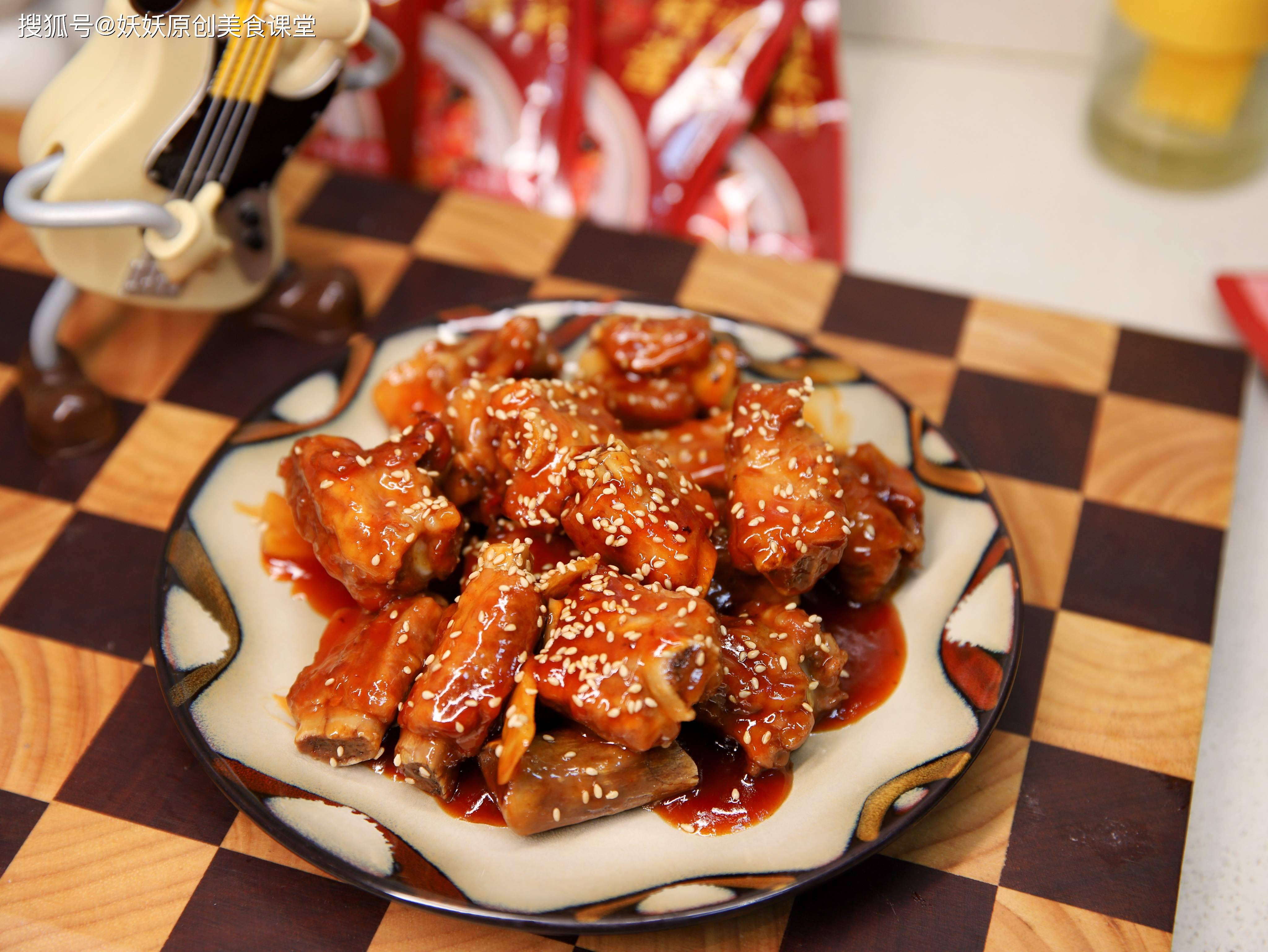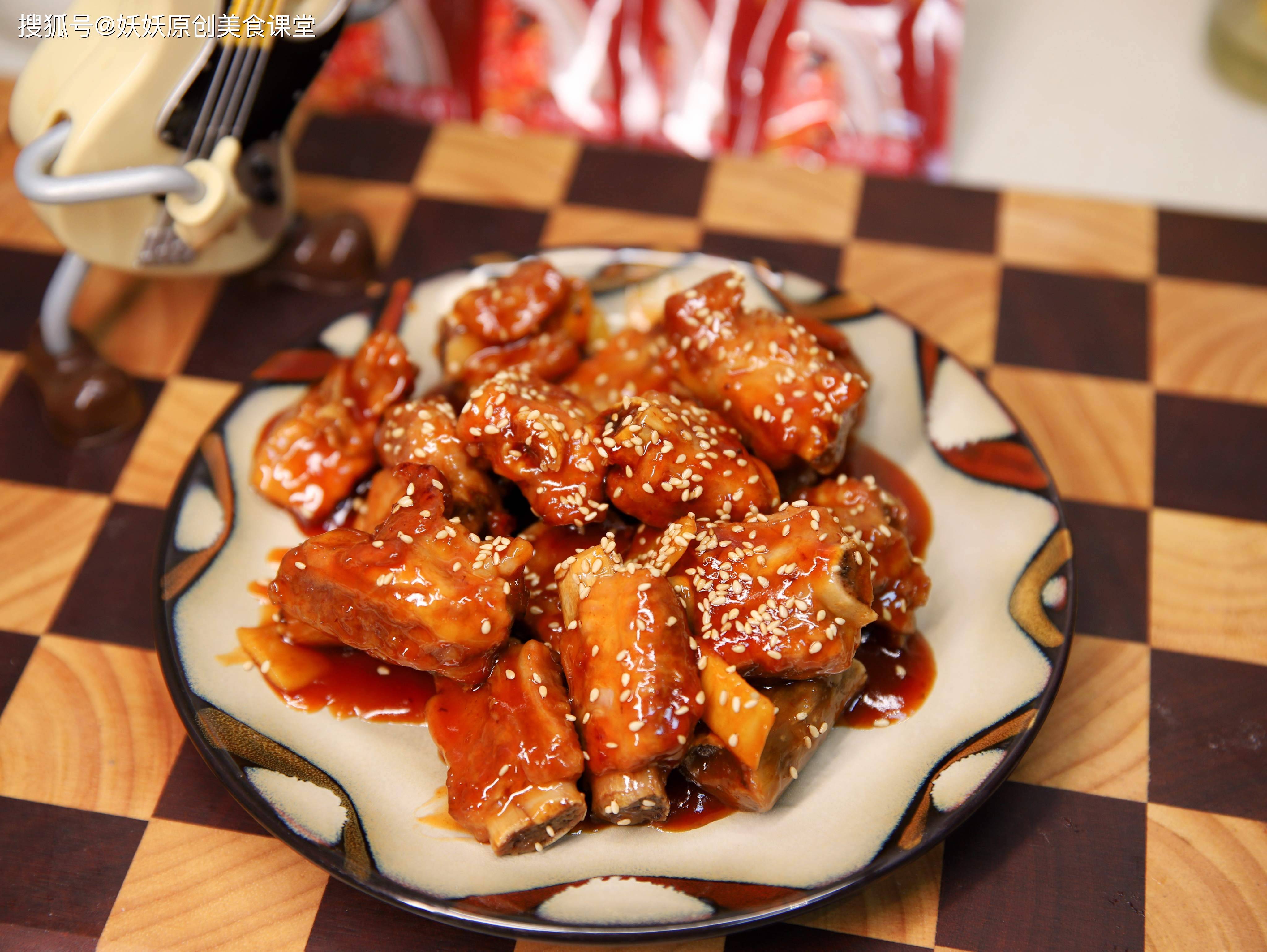 用料:猪肋排适量,生姜一块,糖醋酱两包,熟芝麻少许,水淀粉半碗,老抽一勺。