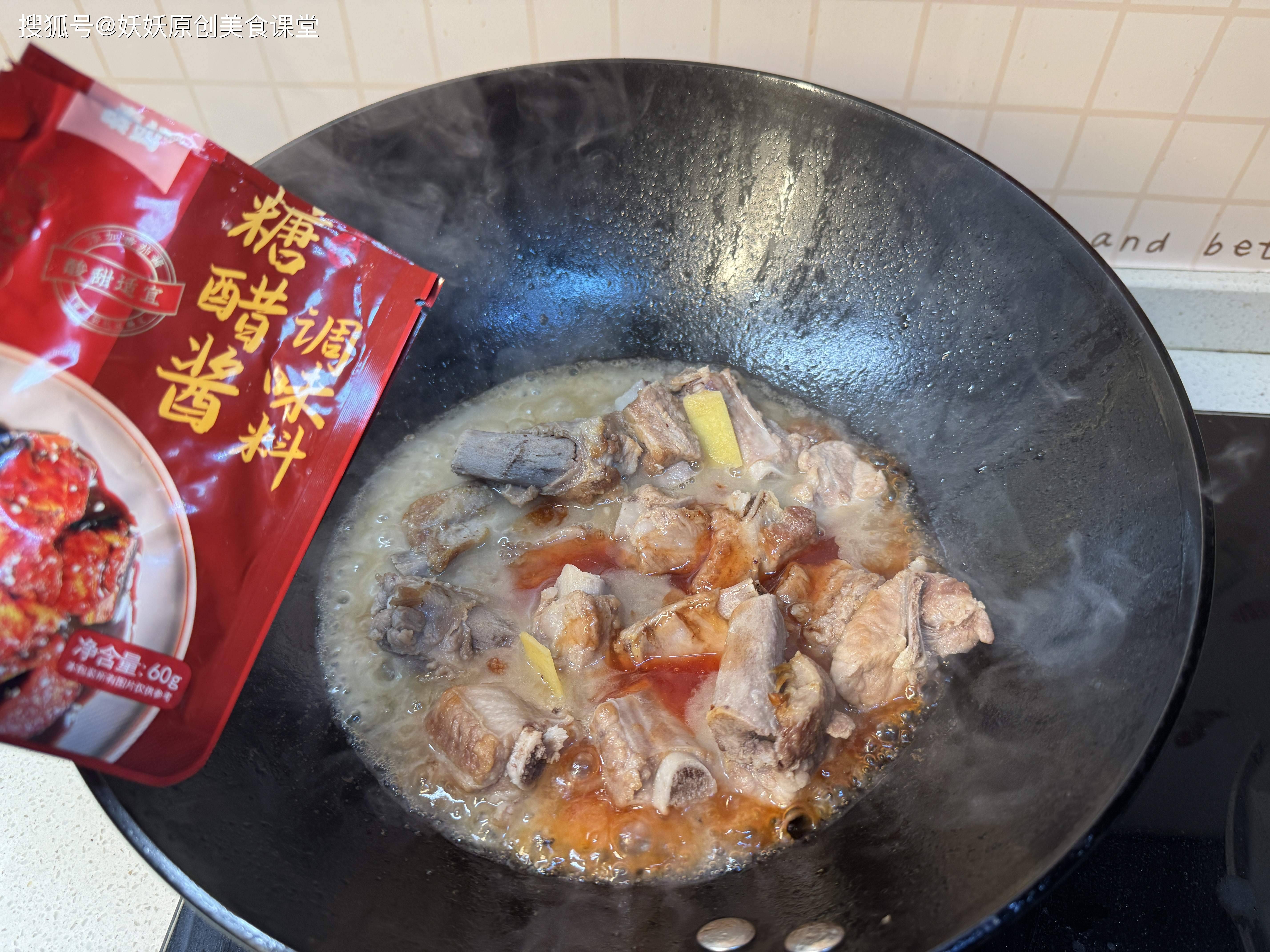 4,待汤汁收得差不多干了,加入半碗水淀粉勾芡,加一勺老抽上色,加入两包糖醋酱调味料,用现成的糖醋酱,味道正宗,不用再自己调味了,很多朋友不会调,网上的配方自己学不会,可以用这种现成的糖醋汁,基本跟饭店里是一样的味道,甚至更好吃。