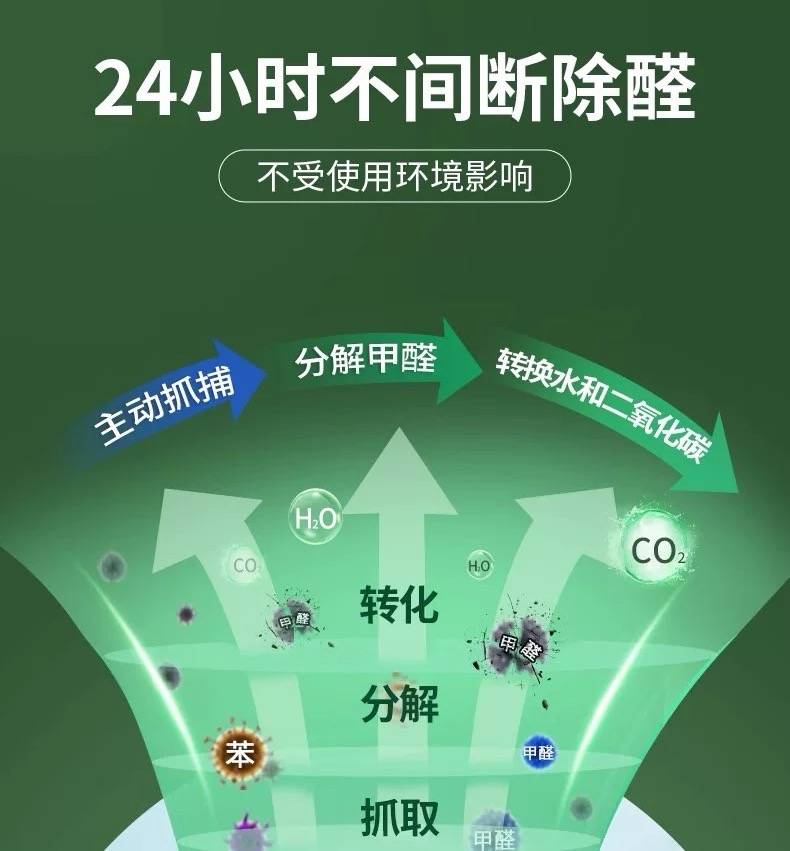 而我们要做的,是“吸附+分解”双管齐下:先用高效吸附产品锁住空气中的游离甲醛,再用专业分解产品深入板材内部,把结合态甲醛直接分解成无害物质,从根源切断甲醛释放,这样才能实现48小时快速见效、长期不反弹。