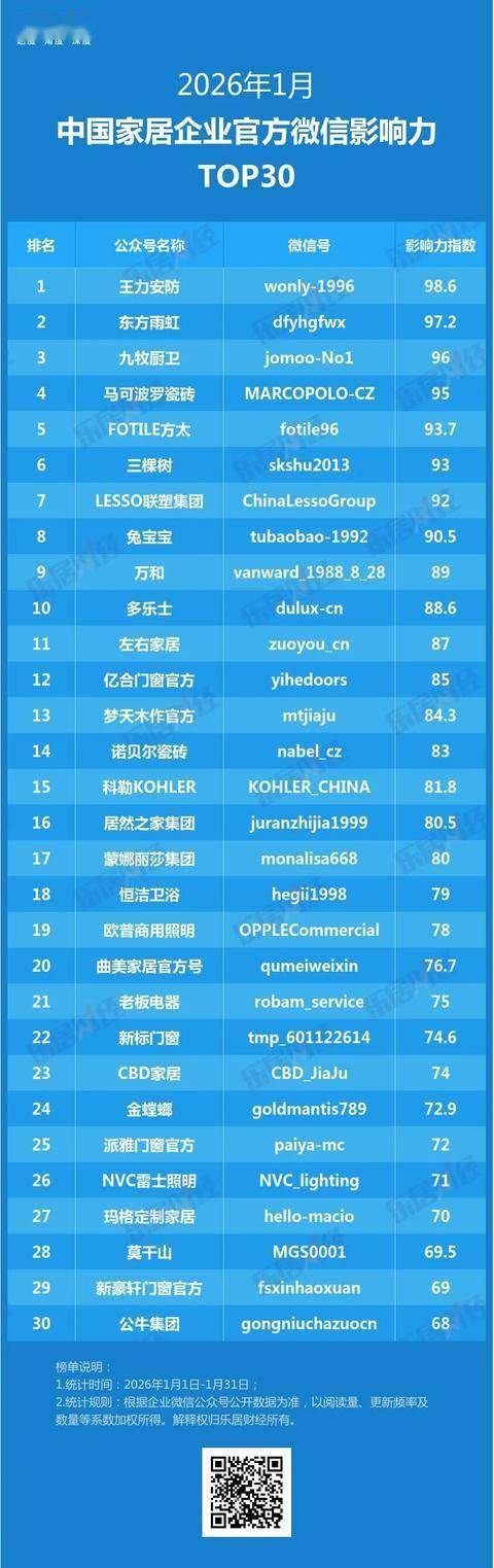 本期榜单,乐居财经共收集148家在1月份有更新的家居企业微信号作为样本,根据库内账号的多项公开数据,包括文章推送频次、总发文数量、总阅读量,以及单篇文章的爆文指数等系数加权得出影响力指数。