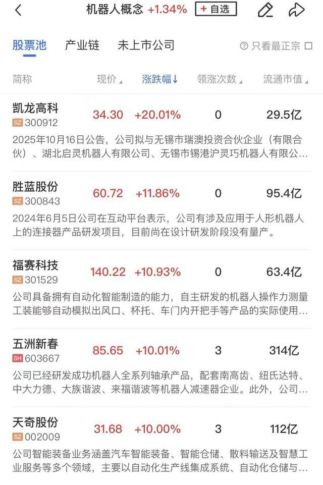 机器人概念股,天奇股份、五洲新春涨停,模塑科技、通光线缆、百达精工、万向钱潮、方正电机等纷纷跟涨。