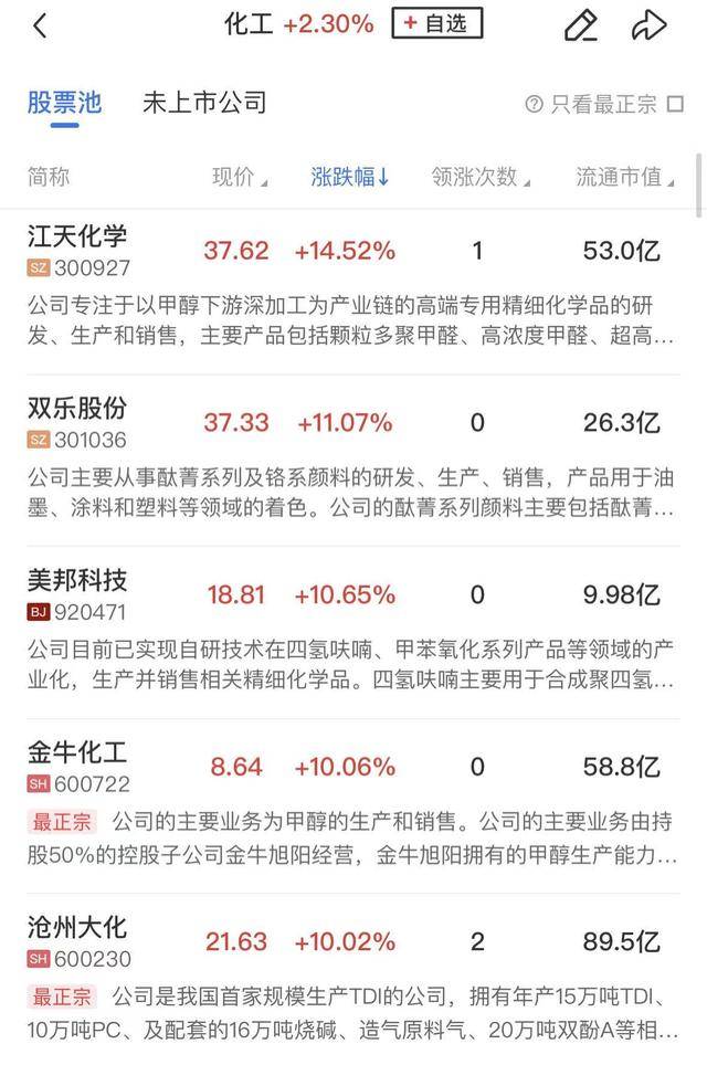 板块上,化工股涨幅居前,百合花、闰土股份、海翔药业、沧州大化、百川股份、德美化工等个股涨停,江天化学、多氟多、美农生物、新和成等个股涨幅居前。