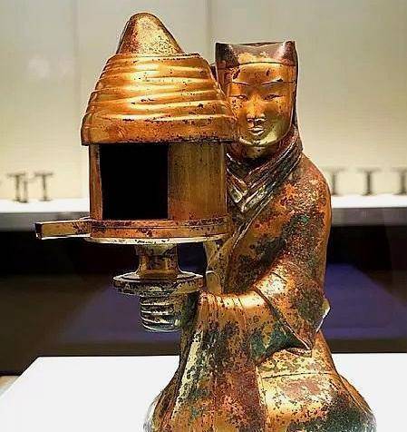 首先来看一盏西汉时期的长信宫灯,它现藏于河北博物院,形成于汉文帝时期。长信宫灯不仅是国宝级的文物,其青铜鎏金的质地、巧妙的构造和生动的造型,都是它广为人知的特点。这盏灯有一个鲜为人知的故事。传说长信宫是窦太后的寝宫,窦太后每晚洗澡时,常常由尚沐女官手持灯具为她照明。宫中的工匠以此为灵感,制作出了这盏精美的灯具。光与影交织之间,似乎仍能感受到那段历史的辉煌与神秘。
