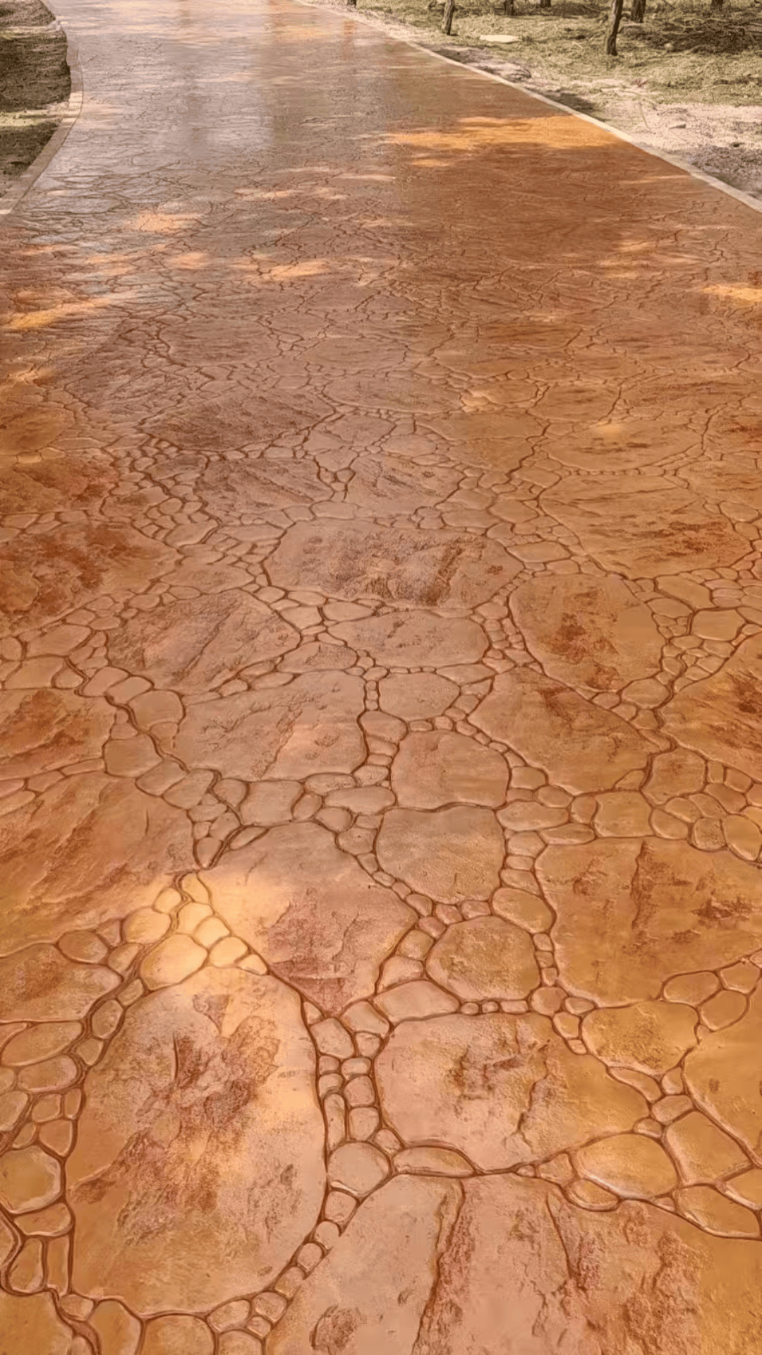 工艺上采用行业成熟的彩色压花混凝土施工技术,选用合格的环保混凝土与无机颜料,严控施工细节,确保地坪色泽均匀、纹理清晰,抗压强度与耐磨性能满足乡村刚需场景使用需求,地坪使用寿命可达8年,提供5年质保服务,售后响应及时,可快速处理后期轻微开裂、色差等问题。