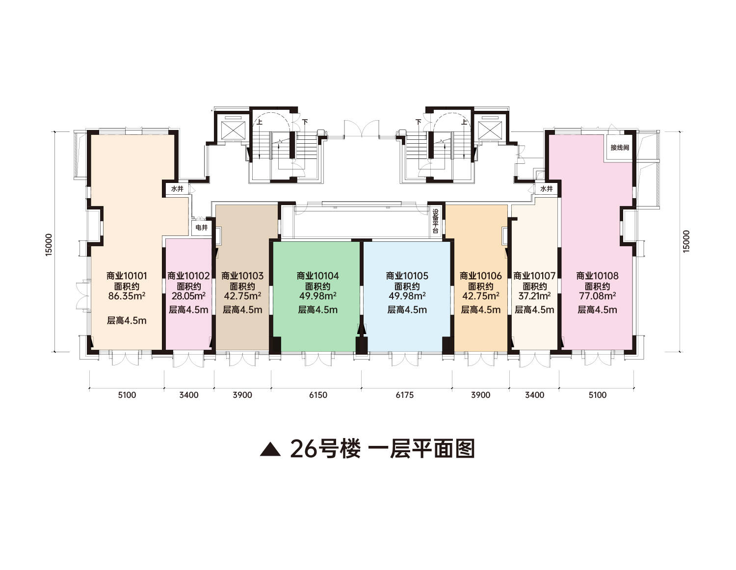 首层层高多数为6米(纯一楼层高4.5m-6m,二楼约4.5m)可隔二层,满足多种业态的经营需求,如零售的仓库、理发店二楼的美容、咖啡店二楼的小包房等,提高经营面积与功能的复合性,买一得二。