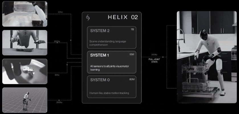 而在Helix 02中,S1连接了全部传感器,并直接控制整个机器人。
