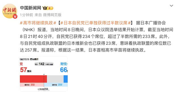 据日本广播协会(NHK)报道,当地时间8日晚间,日本众议院选举结果开始计票,截至当地时间8日21时40分许,自民党已获得234个席位,超过了半数所需的233席。此外,与自民党组成执政联盟的日本维新会也已获得23席,意味着执政联盟的席位数已达257席。报道称,根据这一结果,日本首相高市早苗将继续执政。