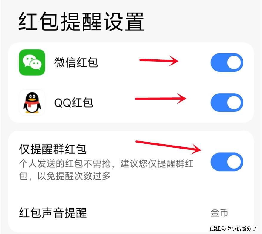 我们点击更多设置,然后把要提醒的红包类型开关打开,像微信红包、QQ红包,这些开关打开,以及还可以把下面的仅提醒群红包开关打开,这样就能避免群消息过多,对我们造成打扰!