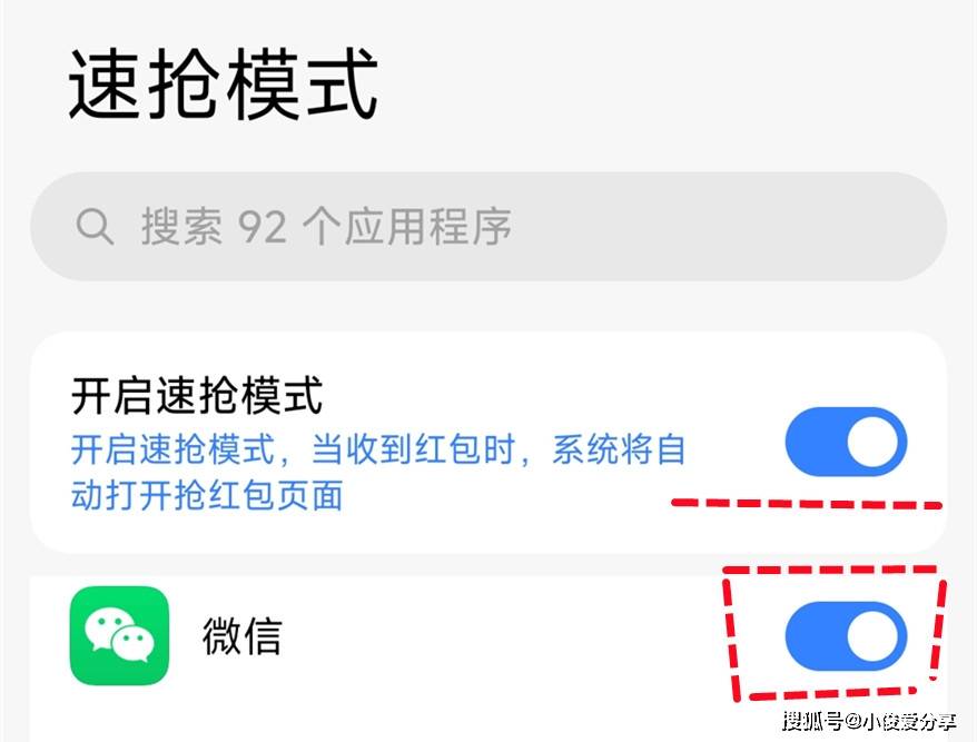 设置完提醒之后,咱们再返回去,然后点击速抢模式,接着把【开启速抢模式】后面的开关打开,开关变成蓝色就打开了,打开之后往下找到【微信】,把微信后面的开关也打开!