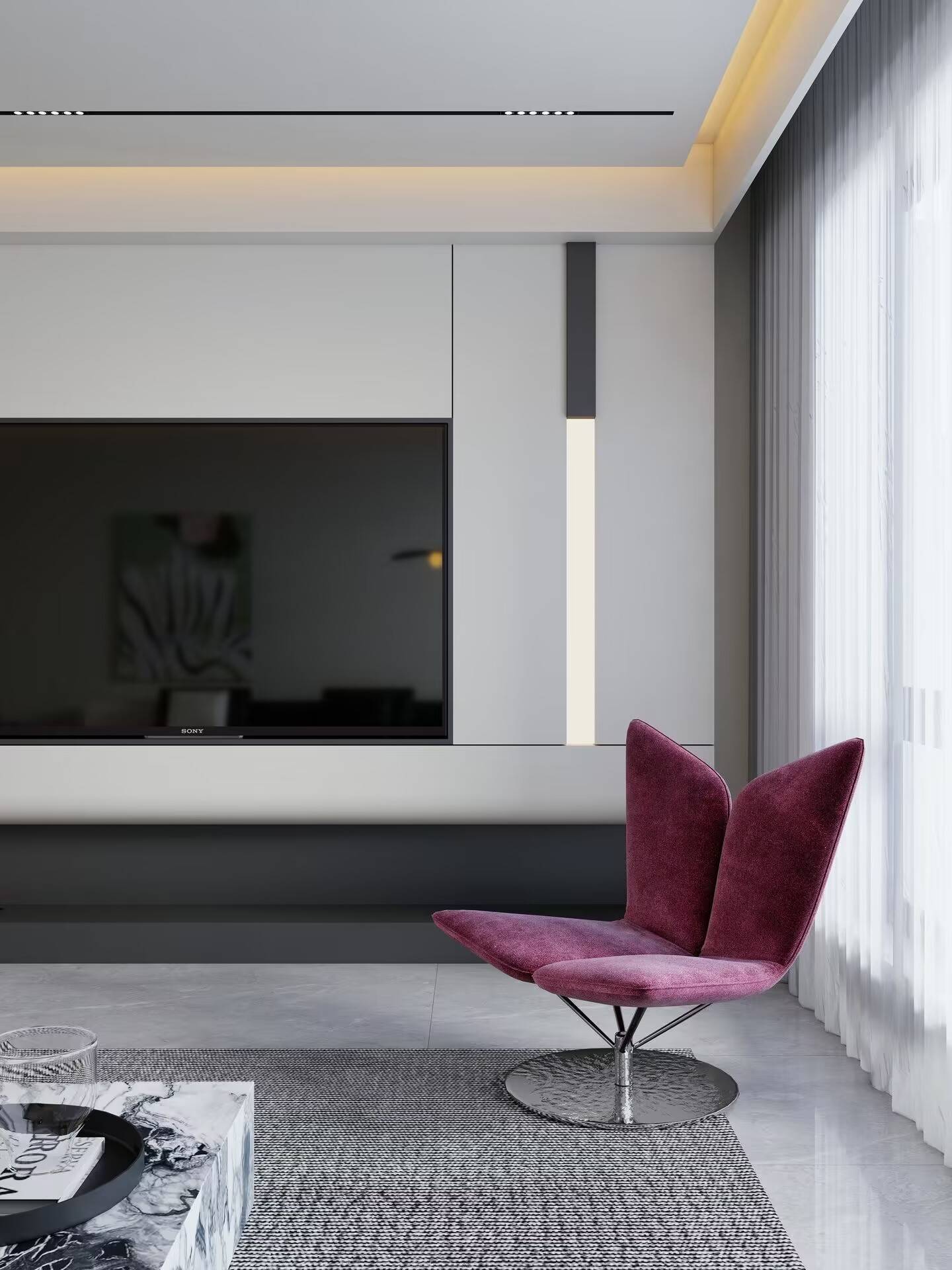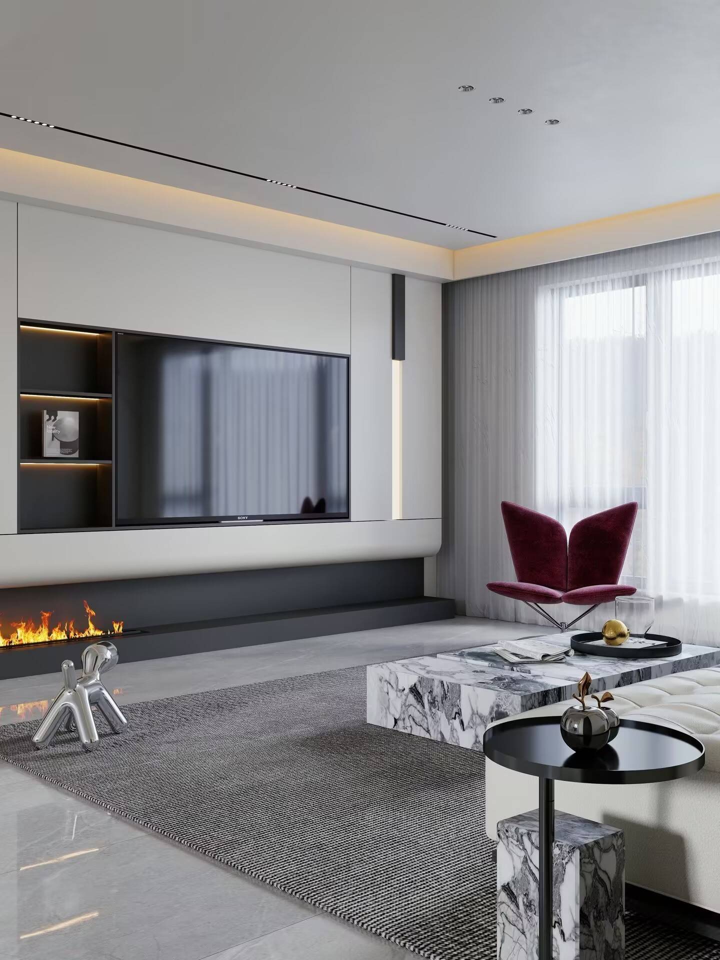 这套140㎡的房子,我们用黑白灰打底,在电视墙做了悬浮设计,嵌入开放式格柜,藏起杂乱的同时,也成了展示她手办的小天地。客厅那把酒红色的单人椅是点睛之笔,像一抹朱砂,在冷静的空间里撞出热烈的情绪。