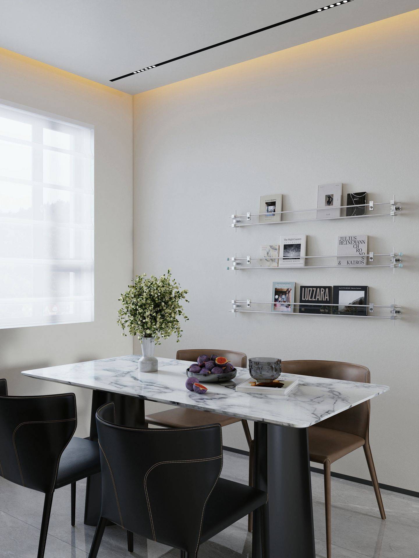 餐厅的大理石餐桌是她坚持要选的,搭配极简的悬浮书架,阳光好的午后,在这里吃早餐、看绘本,是她一天里最治愈的时刻。