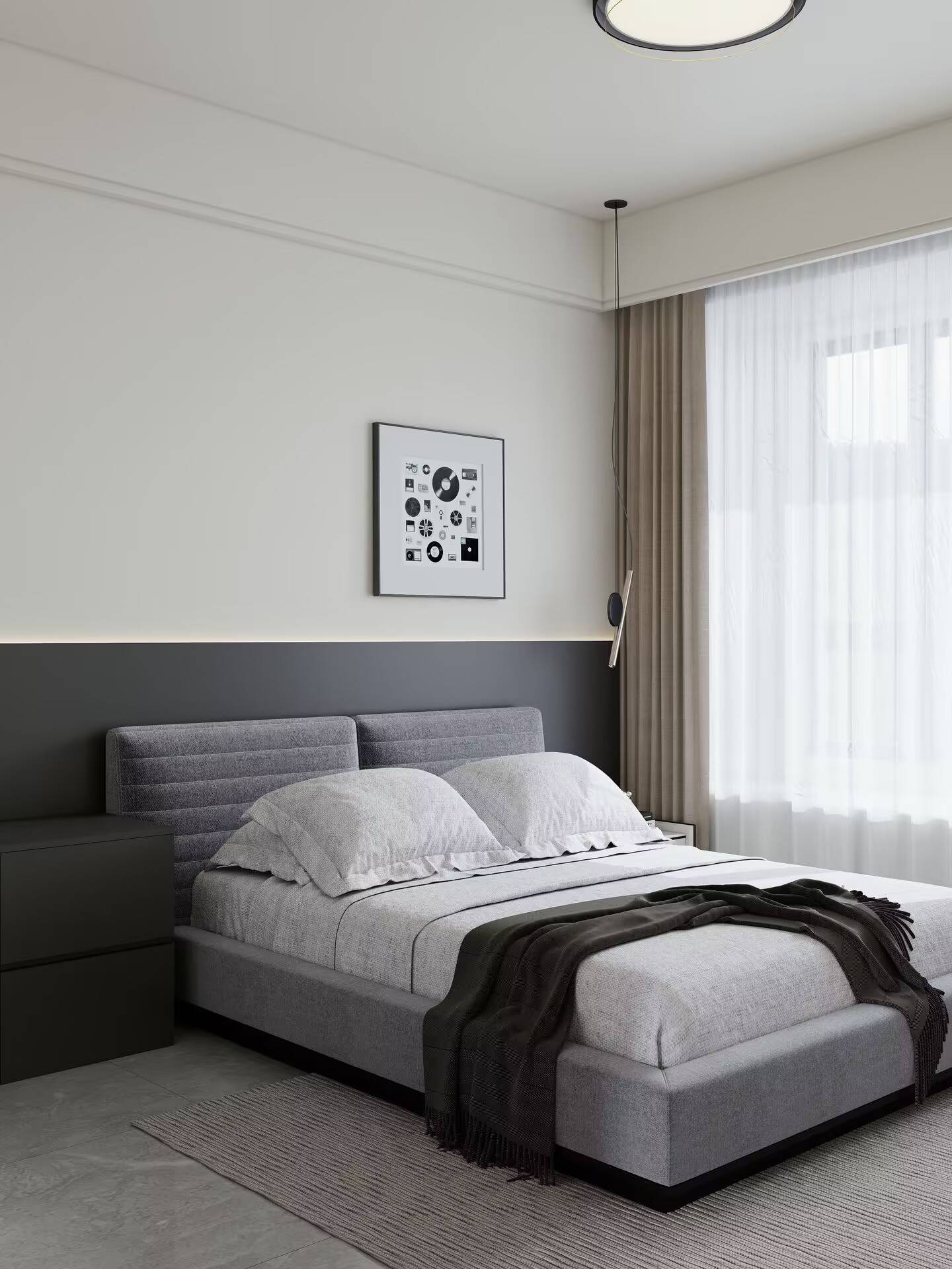 卧室延续了低饱和度的温柔感,硬包背景墙和床品的浅灰形成层次,没有多余的装饰,只在床头留了一幅艺术画。她笑着说,现在每天都能睡满8小时。