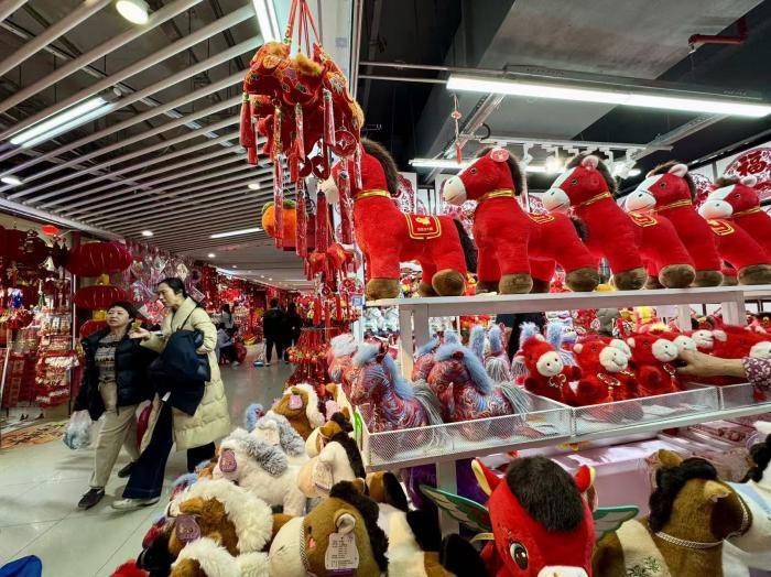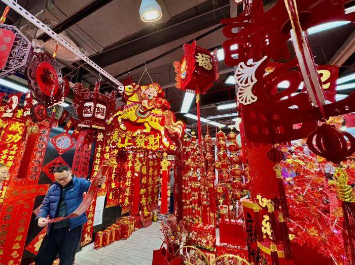 春节临近,北京百荣世贸商城二期五层“年货一条街”一片红火。春联、福字、马年生肖挂饰等节庆小商品迎来销售高峰,日均客流较平日翻倍,红色装饰铺满摊位,氛围感拉满。