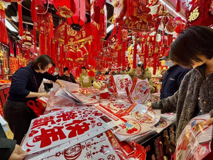 今年除了烫金春联、静电窗花等经典款外,融合祥云纹理的缎面春联、卡通马形象福字、磁吸式国潮文创套装备受青睐,年轻消费者扎堆挑选定制祝福语的创意款。