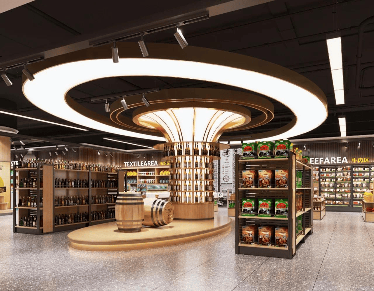 - 精品超市可局部用木饰面板、金属条做点缀,提升质感。