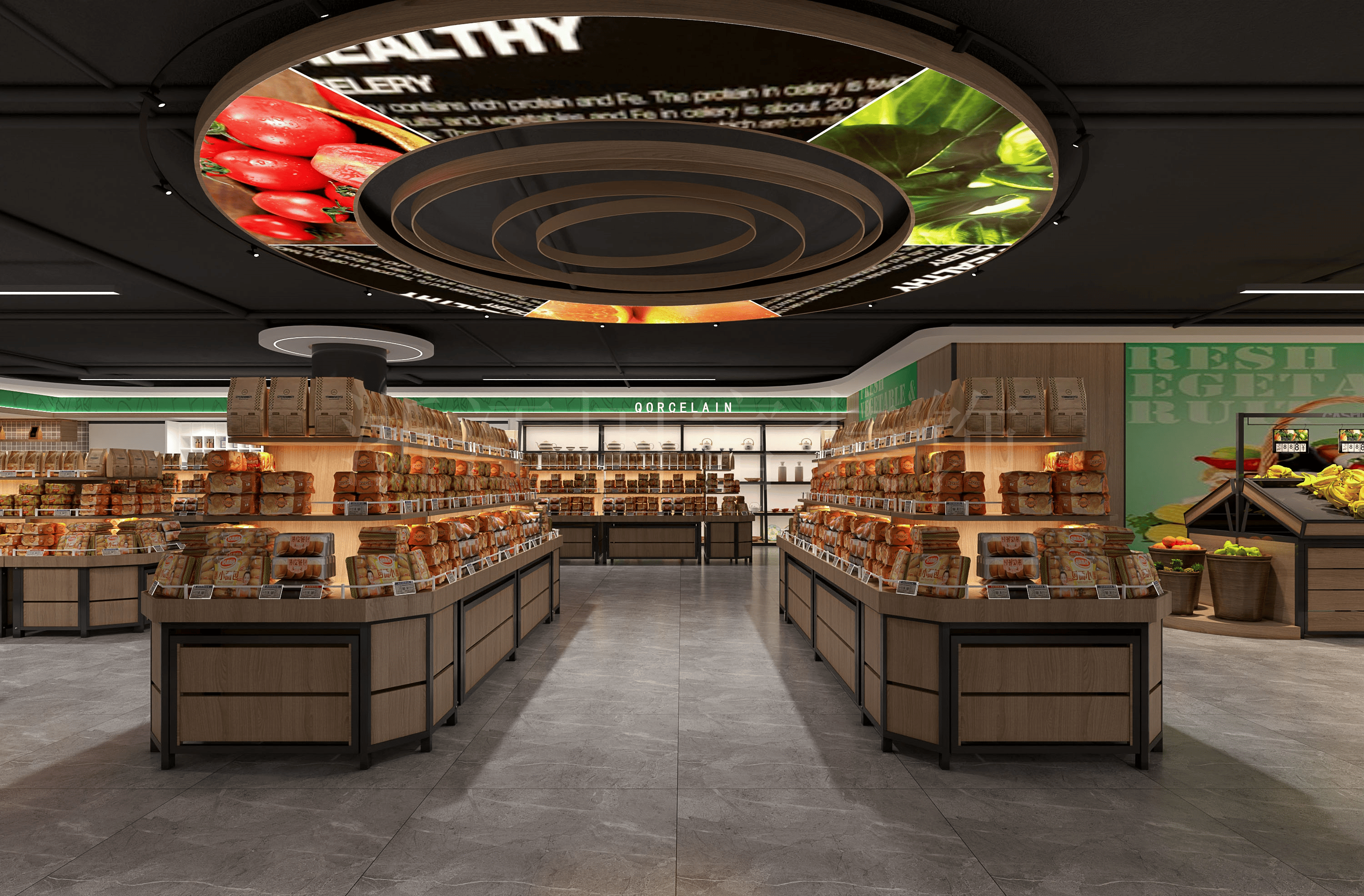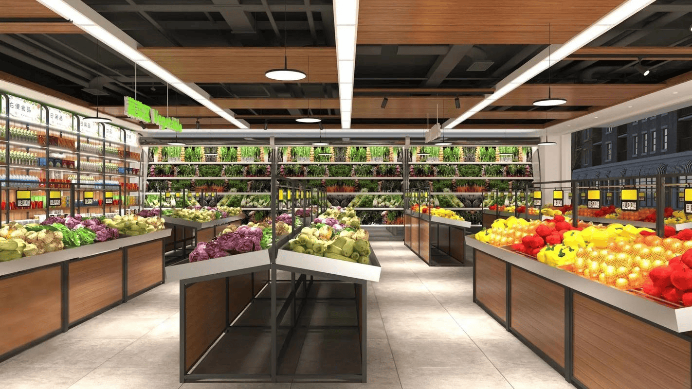 超市属于高频次人流场所,硬装优先选耐磨、防水、易擦洗、抗污的材料,同时针对生鲜区、水产区等特殊区域做专项处理,减少后期维护成本。