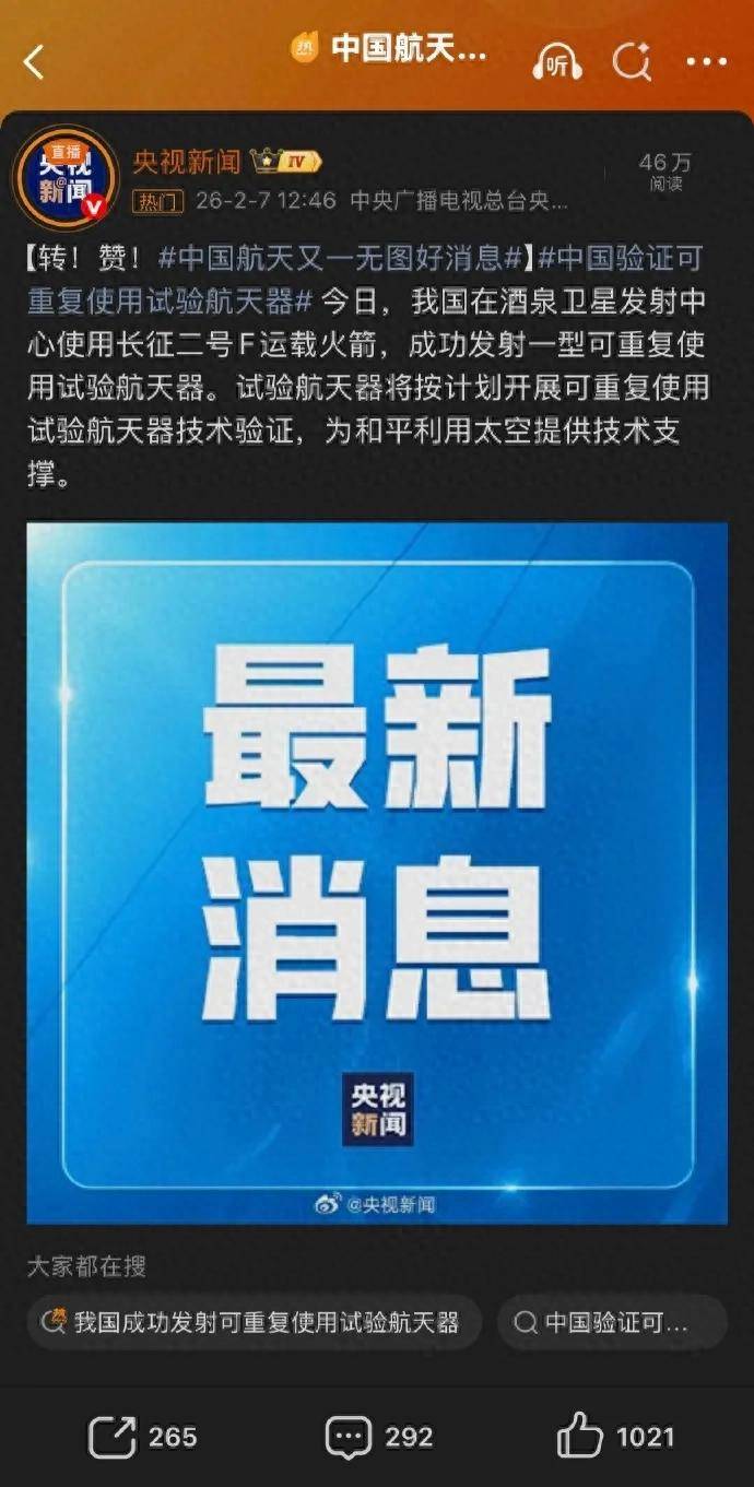 据报道,2026年2月7日,中国在酒泉卫星发射中心使用长征-2F型运载火箭,成功发射一型可重复使用航天器。该型可重复使用航天器将按照预定计划,开展技术验证工作,重点验证可重复使用性能,在轨服务能力和再入返回技术,为未来低成本太空运输奠定技术基础,更为中国和平利用太空提供技术支撑。很明显——这是一个“字少事大”型新闻。