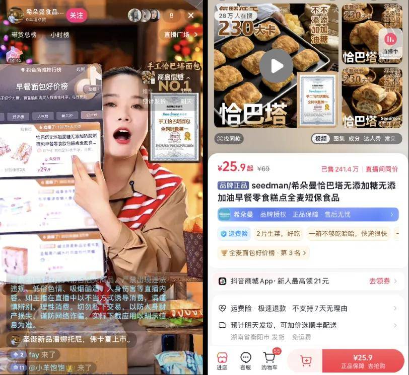 比如希朵曼,这家成立36年、来自衡阳的连锁烘焙品牌走向线上,将抖音作为主攻渠道,在直播和短视频场景中孵化出单链接240万人购买的恰巴塔爆款,以0糖、0油、0添加作为卖点,详情页称“累计销售9650000颗”“手工恰巴塔面包全网销量第一”;又如椒达人开出线上旗舰店,选择复刻“花椒腰果恰巴塔”等线下烘焙店同款,天猫平台显示单品销量已售10万+。
