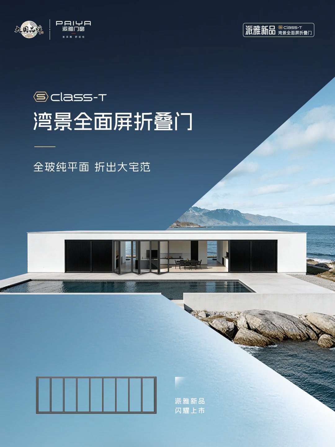 全玻纯平面,折出大宅范!打造理想奢居,户外门从来都是核心考量 ——S Class-T 湾景全面屏折叠门,以美学创新、性能升级、安全守护三大核心优势,为豪宅量身定制,让家不仅有高颜值的门面担当,更是品质生活的象征。1️⃣全面屏大玻璃,让门窗做建筑的风向标关闭时,合页全隐藏,一体纯平设计,成就外立面全是玻璃的大气外观2️⃣无立柱转角,两重空间自在切换打破传统门框的束缚,开合之间,270°景观无遮挡,让自然与家瞬间切换到亲密互动模式3️⃣3.5米大层高,契合未来人居新审美最高可做3.5米,满足新住宅超3米层高需求,造极致采光,让家舒展起来4️⃣断桥结构,助力绿色保温节能标配27A大中空玻璃,34mm超宽隔热条,有效阻止室内外冷热交换,构筑舒适家居环境5️⃣型材厚达2.2mm,不惧超强风压侵袭全力守护家的安全与舒适,适用高层、沿海及华南等台风频发区6️⃣15mm缓冲胶条,每一次开合都温柔门扇之间,采用EPDM软性胶条填充,即使重力折叠下,也能避免夹伤问题,贴心守护家人安全奢居的本质,是让空间与生活同频。S Class-T湾景全面屏折叠门,以大玻璃外观,构筑建筑美学;以隔音隔热性能,守护舒适日常;以超规安全,守护家居安全;兼备仪式感与舒适感,让居者自在奢享每寸好时光。