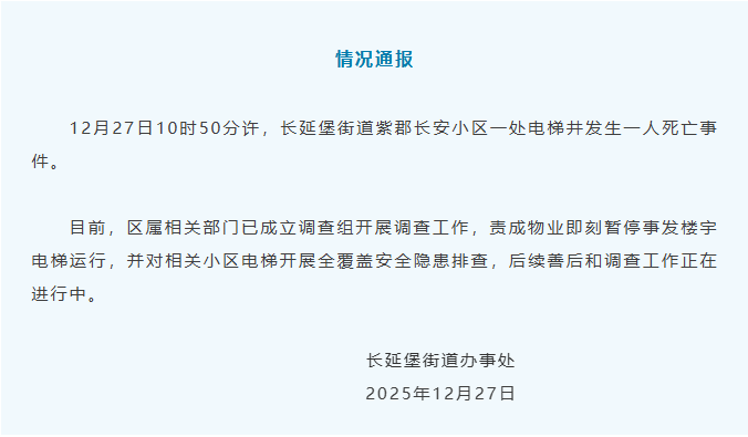 西安“今日雁塔”发布情况通报:12月27日10时50分许,长延堡街道紫郡长安小区一处电梯井发生一人死亡事件。