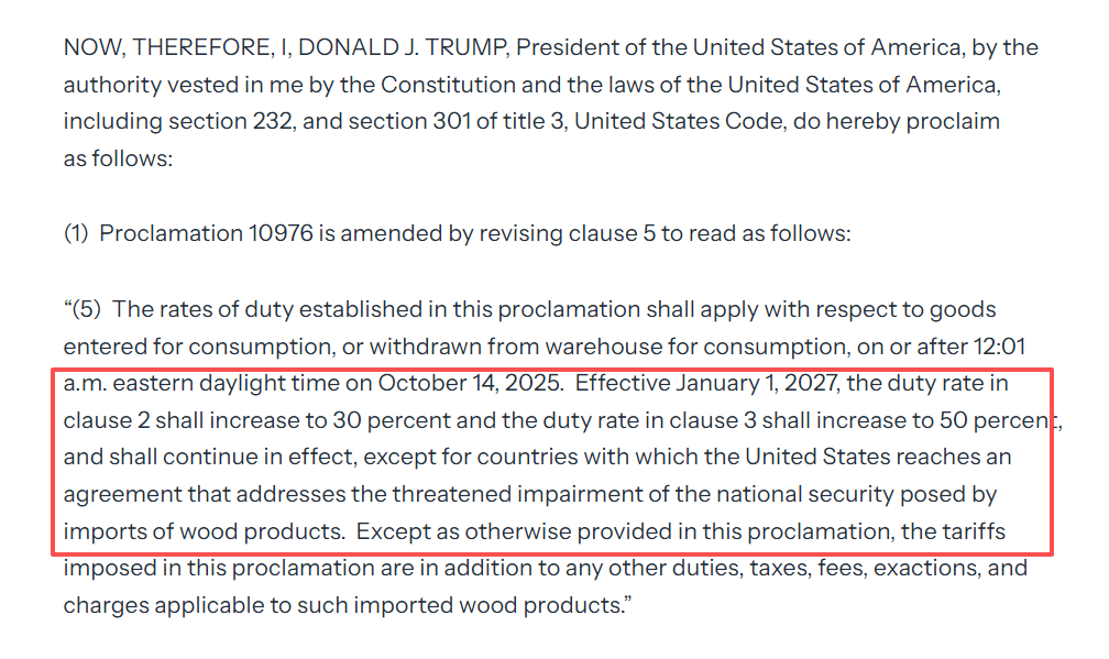 推迟原因:白宫的公告中表示是因为“目前有关木材产品进口的谈判正在取得成效,总统决定推迟提高关税,以便与其他国家进行进一步谈判”。这也意味着相关产品在美国的关税税率可能会在未来进一步出现变化。