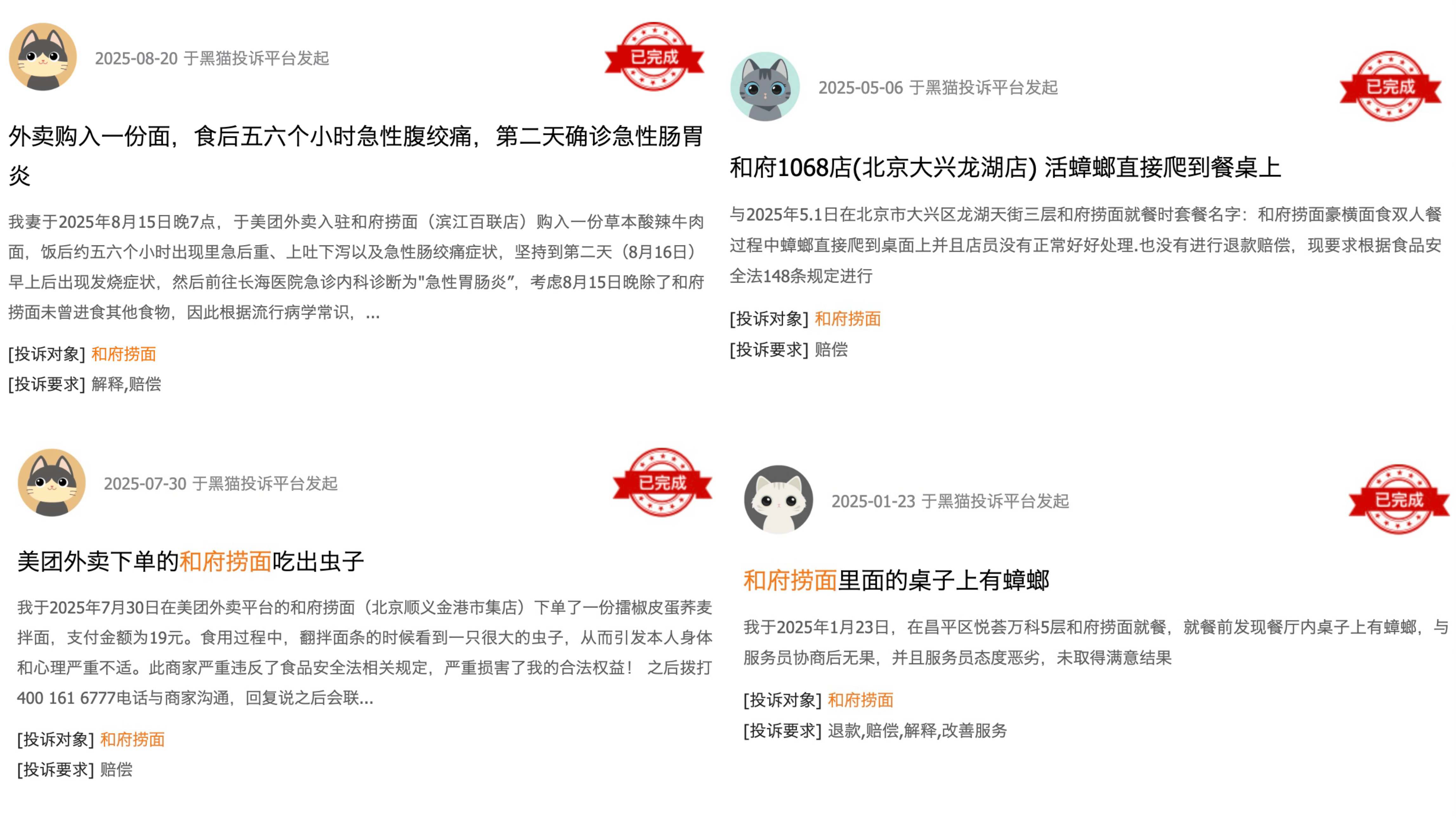 截至目前,黑猫投诉平台上也有与“和府捞面”关联投诉213条,消费者所诉内容包括外卖及门店就餐吃出异物包括虫子、头发、吃完面急性胃肠炎、发现店内有蟑螂等等。