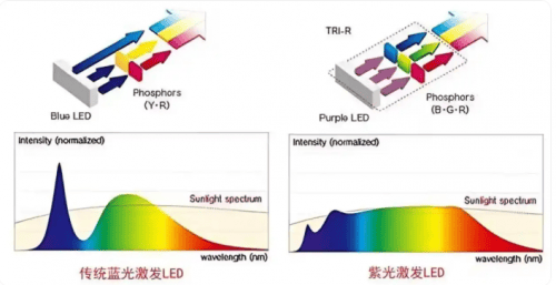 现在目前市面上的全光谱,主要分为两种:蓝光激发全光谱和紫光激发全光谱传统的蓝光激发方式,会天然产生450nm左右的高能蓝光峰值,即使后期再怎么过滤蓝光,也只能削弱而不能从源头解决解决蓝光过高的问题。久而久之,眼睛依然容易疲劳,尤其是儿童和长期近距离用眼的人群。