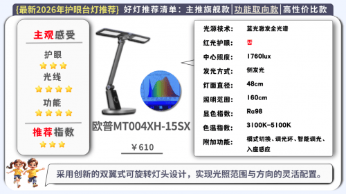 欧普MT004XH-15SX 的优势在于照明覆盖与调节灵活性,它采用了创新的双翼式可旋转灯头设计两个独立的发光面能够自由调整角度,从而实现光照范围与方向的灵活配置,最大可覆盖160厘米的桌面。此外它的灯头还采用了镂空设计,可以进行多角度翻转,可调光的角度很灵活,而且机身采用金属与工程塑料结合,确保了调节转轴的耐用性。功能上集成了环境光感应、多档位色温切换和定时提醒等实用配置,操作通过直观的旋钮与触控完成,适合需要随时灵活调节照射范围的人群或家庭。