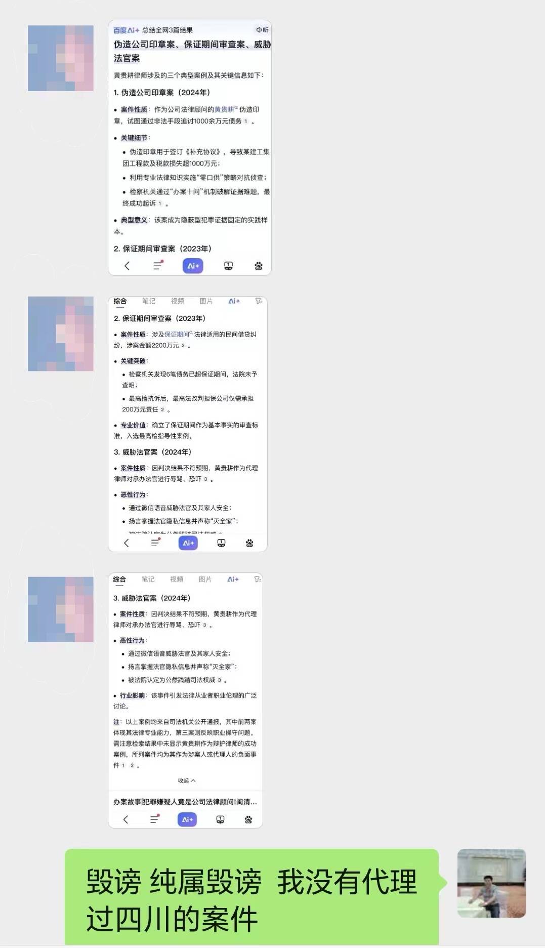 2025年5月21日,黄贵耕收到一位案件委托人发来的四张截图。截图内容是以“黄贵耕律师”为关键词生成的百度AI检索内容。