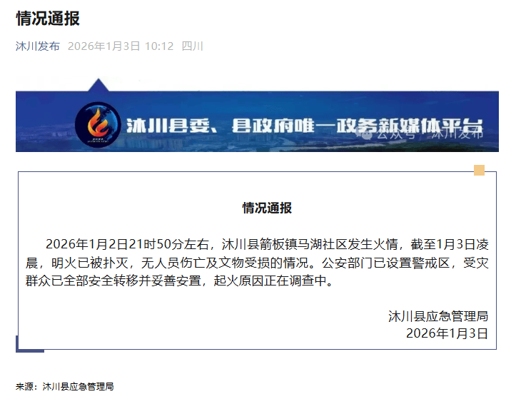 2026年1月2日21时50分左右,沐川县箭板镇马湖社区发生火情,截至1月3日凌晨,明火已被扑灭,无人员伤亡及文物受损的情况。公安部门已设置警戒区,受灾群众已全部安全转移并妥善安置,起火原因正在调查中。