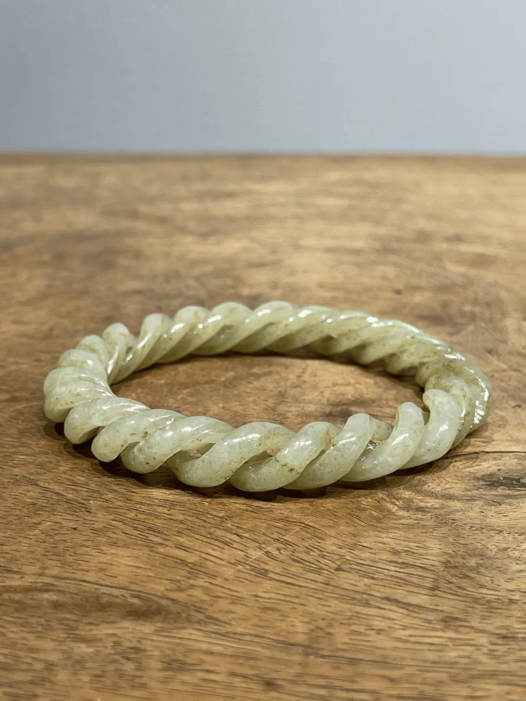 这是一只和田糖沁白玉鏤空透雕而成的活动麻花环手镯,以整块玉石镂空透雕成两条独立活动的扭曲环,整块镂雕无拼接,就是古代俗称麻花手镯的玉雕工艺,以玉质温润细腻之和田糖沁白玉雕出独特手镯,造型典雅贵气,旧时代玉雕技艺精湛,古韵十足,色泽淡褐偶带糖色斑点沁,质地半通透,当代淑女佩戴特显高雅气质与独具一格之品味。