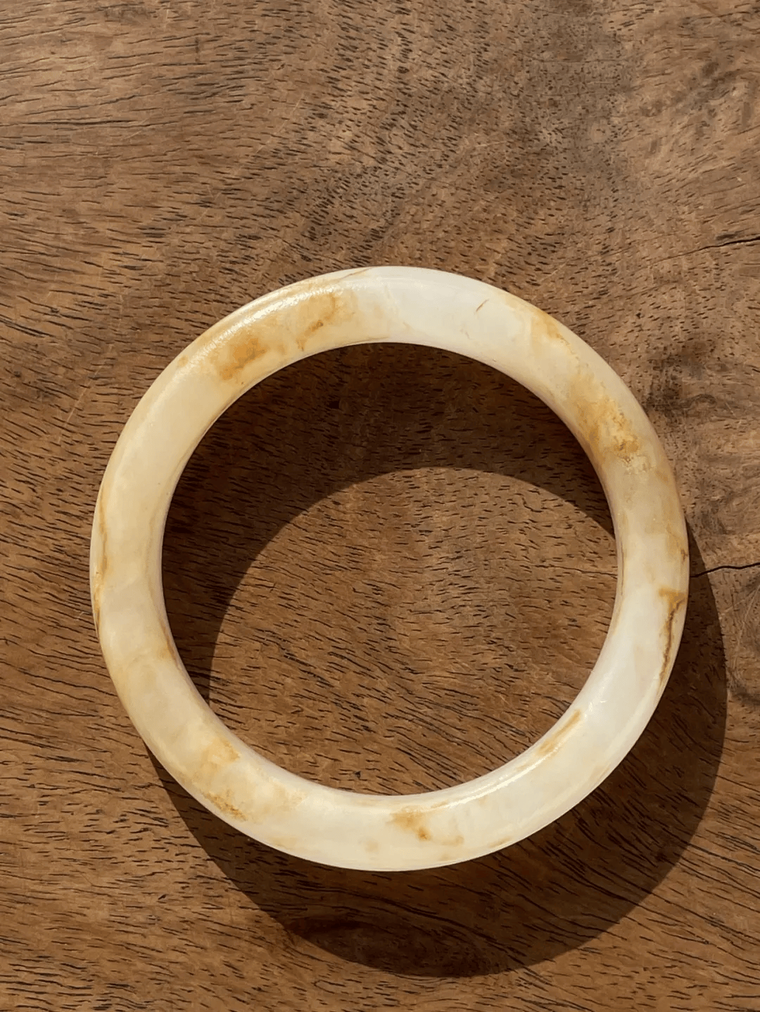 这是一只玉质温润、尺寸大的和田金沁白玉粗圆条手镯,此手镯取材质地半通透、色泽纯白带金黄色沁斑的和田玉,结构紧致细密的新疆和田白玉,除金黄色细斑点外,质地细腻且油润,整块玉料精心雕琢成内平切粗圆条形手镯,造型典雅贵气,是难得一见尺寸碩大的新疆和田玉旧手镯。