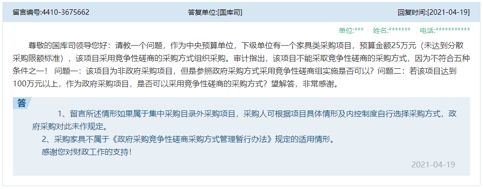 答:1.留言所述情形如果属于集中采购目录外采购项目,采购人可根据项目具体情形及内控制度自行选择采购方式,政府采购对此未作规定。