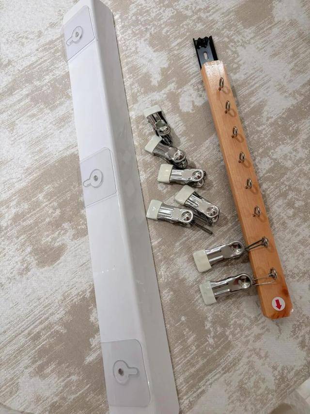 亚克力板自带透明粘钩,直接粘上去就行,伸缩杆可以用免钉胶粘到亚克力板上。