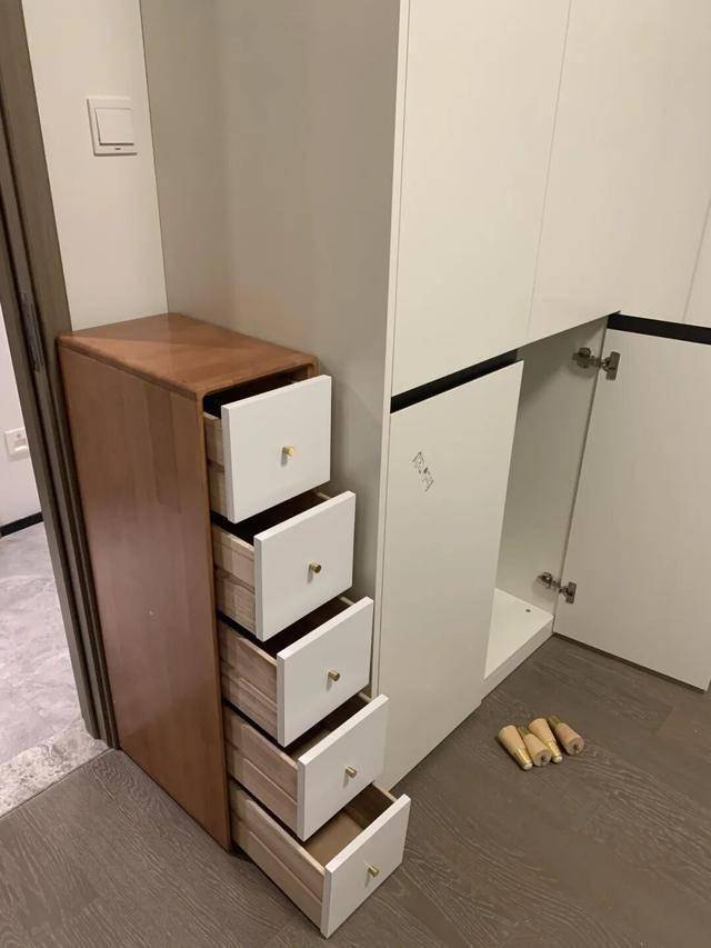 本着不浪费的原则,就网购一组25cm宽的超窄五斗柜,以后可以用来收纳首饰、袜子、内衣等物品,也算是救回来了一点空间。