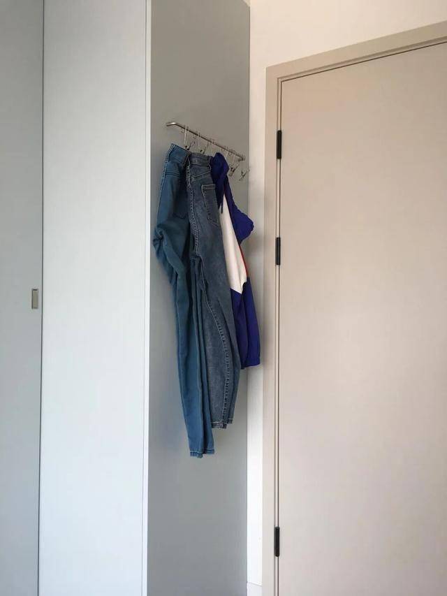 正好还需要一块挂衣服的空间,索性就在门后的柜体上装了个不锈钢长拉手,再搭配几个挂钩夹子,完美。