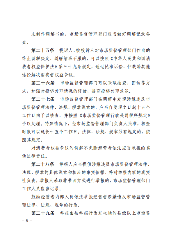 第二十三条市场监督管理部门在调解中发现涉嫌违反市场监督管理法律、法规、规章线索的,应当自发现之日起十五个工作日内予以核查,并按照市场监督管理行政处罚有关规定予以处理。特殊情况下,核查时限可以延长十五个工作日。法律、法规、规章另有规定的,依照其规定。 对消费者权益争议的调解不免除经营者依法应当承担的其他法律责任。 |