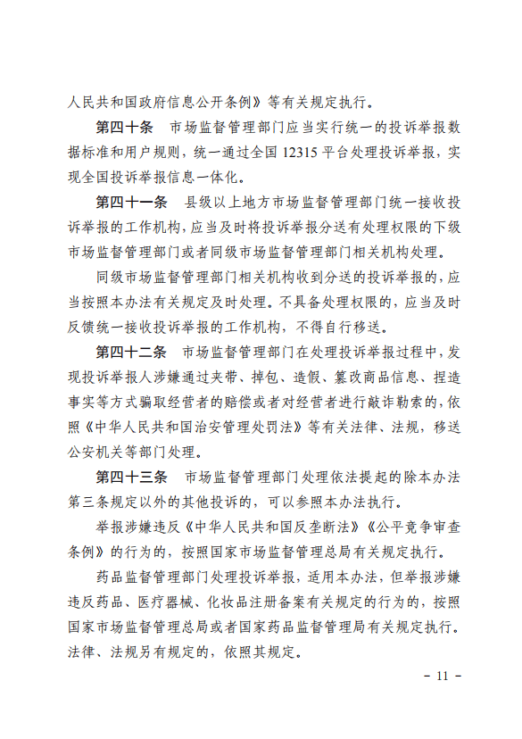 第四十条 市场监督管理部门应当实行统一的投诉举报数据标准和用户规则,统一通过全国12315平台处理投诉举报,实现全国投诉举报信息一体化。 |