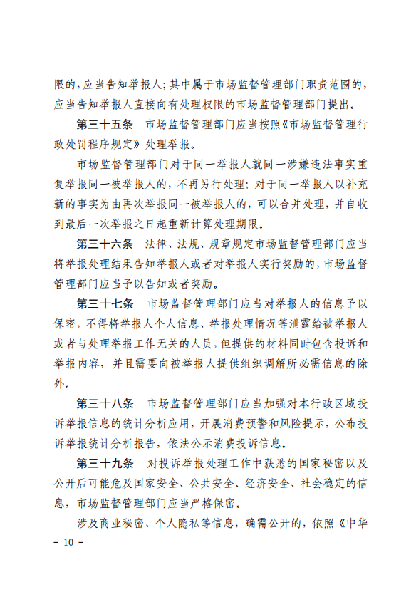第三十五条对投诉举报处理工作中获悉的国家秘密以及公开后可能危及国家安全、公共安全、经济安全、社会稳定的信息,市场监督管理部门应当严格保密。 涉及商业秘密、个人隐私等信息,确需公开的,依照《中华人民共和国政府信息公开条例》等有关规定执行。 |