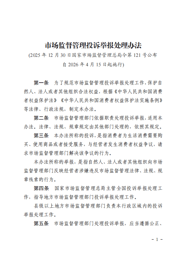 《办法》自2026年4月15日起施行,原《市场监督管理投诉举报处理暂行办法》同时废止。