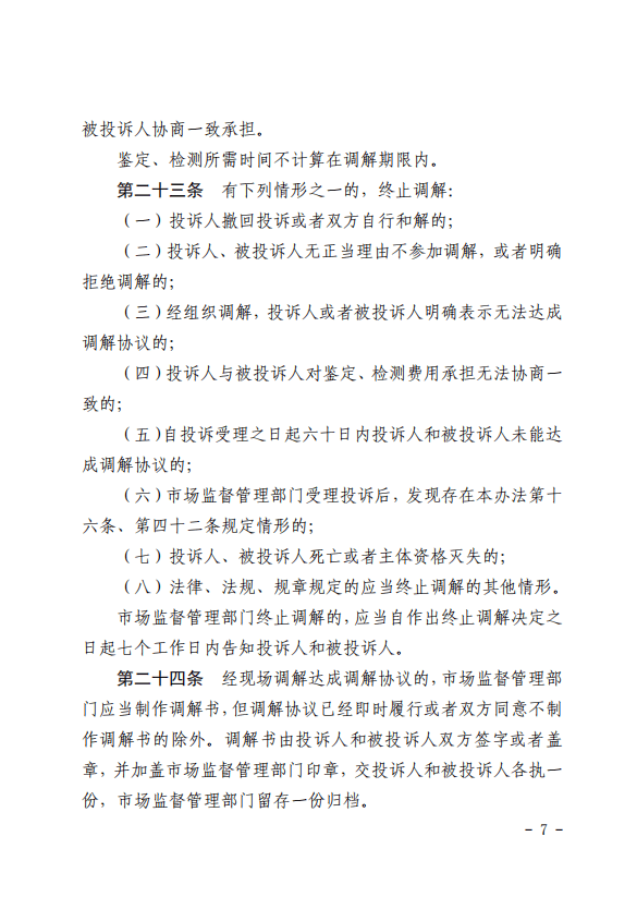 第二十一条有下列情形之一的,终止调解: (一)投诉人撤回投诉或者双方自行和解的; (二)投诉人与被投诉人对委托承担检定、检验、检测、鉴定工作的技术机构或者费用承担无法协商一致的; (三)投诉人或者被投诉人无正当理由不参加调解,或者被投诉人明确拒绝调解的; (四)经组织调解,投诉人或者被投诉人明确表示无法达成调解协议的; (五)自投诉受理之日起四十五个工作日内投诉人和被投诉人未能达成调解协议的; (六)市场监督管理部门受理投诉后,发现存在本办法第十五条规定情形的; (七)法律、法规、规章规定的应当终止调解的其他情形。 终止调解的,市场监督管理部门应当自作出终止调解决定之日起七个工作日内告知投诉人和被投诉人。 |