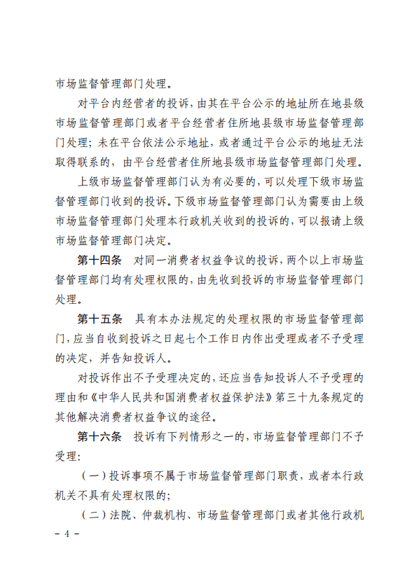 第十二条投诉由被投诉人实际经营地或者住所地县级市场监督管理部门处理。 对电子商务平台经营者以及通过自建网站、其他网络服务销售商品或者提供服务的电子商务经营者的投诉,由其住所地县级市场监督管理部门处理。 对平台内经营者的投诉,由其实际经营地或者平台经营者住所地县级市场监督管理部门处理。 上级市场监督管理部门认为有必要的,可以处理下级市场监督管理部门收到的投诉。下级市场监督管理部门认为需要由上级市场监督管理部门处理本行政机关收到的投诉的,可以报请上级市场监督管理部门决定。 |