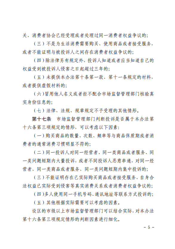 第十七条市场监督管理部门判断投诉是否属于本办法第十六条第三项规定的情形,可以考虑以下因素: (一)购买商品的数量、次数、频率等与商品保质期或者消费者的通常消费习惯明显不符的; (二)同一投诉人对同一经营者、同一类商品或者服务、同一类问题短期内大量投诉,或者不同投诉人恶意串通,对同一经营者、同一类商品或者服务、同一类问题短期内集中投诉的; (三)不能证明存在已实际购买商品或者接受服务、自身合法权益已实际受到侵害等真实消费关系或者消费者权益争议的; (四)多人使用同一手机号码、通讯地址等联系方式投诉的; (五)其他根据实际需要可以考虑的因素。 设区的市级以上市场监督管理部门可以结合实际,对本办法第十六条第三项规定情形的判断因素进行细化。 |