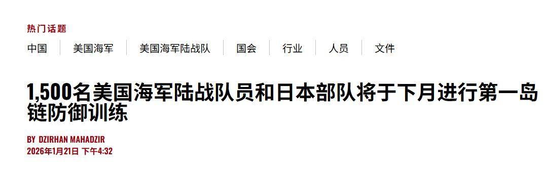 对于日本首相高市早苗拒绝道歉,带来的东亚局势动荡,在1月21日,美军及时给日本首相高市早苗、日本当局、日本自卫队壮胆打气:美国海军新闻网在1月21日报道称,“1500名美国海军陆战队员和日本自卫队将于下月进行第一岛链防御训练”,按照美国方面的介绍,“美国海军陆战队和日本陆上自卫队将于下个月举行双边演习铁拳26”,“届时将有约1550名美军士兵在琉球群岛进行两栖登陆、空中突击等演习。”,“从2月11日至3月9日,日本自卫队与美军进行的铁拳-26联合军演将在琉球群岛的军事设施和训练区举行”。美国海军认为:“琉球群岛是日本和台湾省之间战略咽喉要道上的关键岛屿。这项年度联合军演最初于2006年开始,在美国加利福尼亚州彭德尔顿海军陆战队基地举行,演习于2023年移至琉球群岛。”