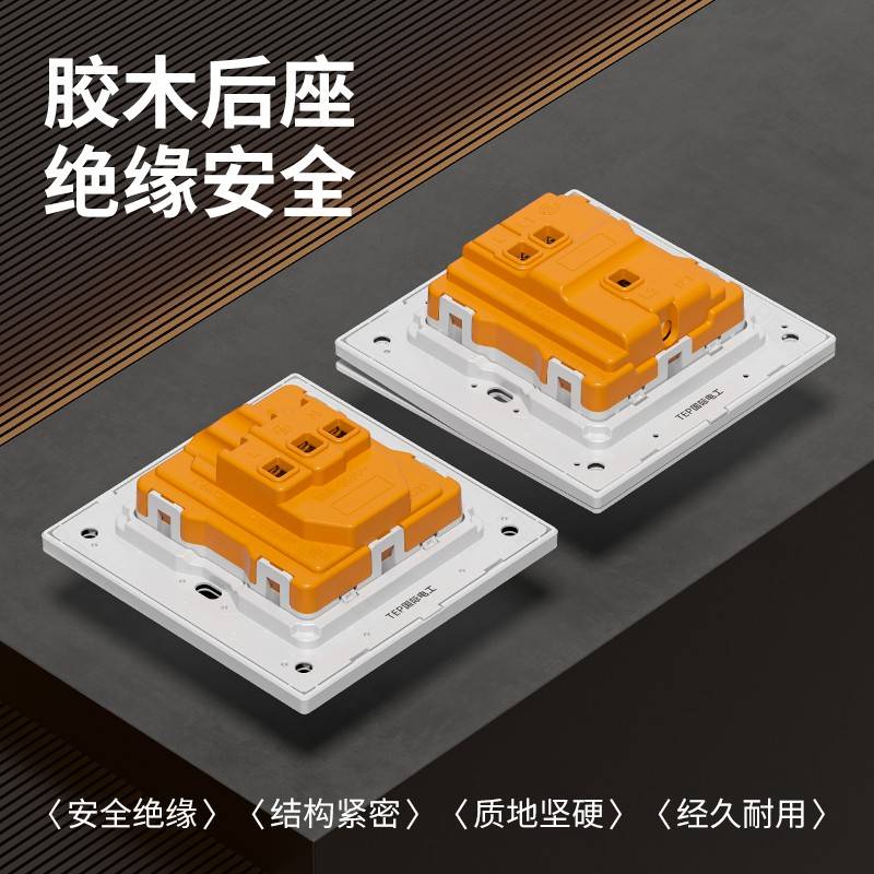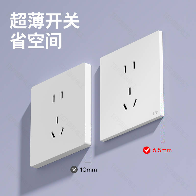 譬如而TEP国际电工超薄系列无框设计的开关更加简约大气,更加现代化,与墙体和现代风格的家装融入度更高,可以说是“百搭款”。