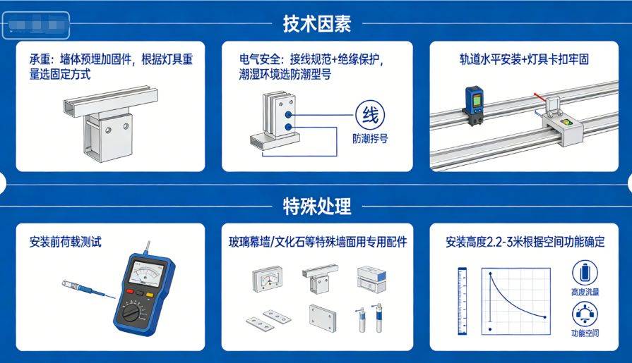 安装技术要点 安墙上轨道灯的安装需要考虑多个技术因素。首先是承重问题,要根据灯具重量和数量选择合适的固定方式,通常需要在墙体预埋加固件。