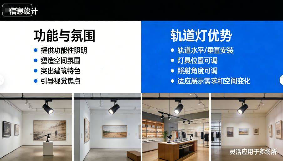 轨道系统可以沿墙面水平或垂直安装,灯具位置可调,照射角度可调,能够适应不同的展示需求和空间变化。在美术馆、博物馆、零售店铺等场所,这种灵活性尤为重要。