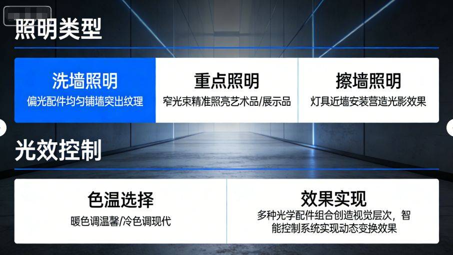 洗墙照明通常使用偏光配件的轨道灯,让光线均匀地铺满墙面,突出材质纹理;重点照明则使用窄光束灯具,精准照亮墙面上的艺术品或展示品;擦墙照明通过将灯具安装在靠近墙面的位置,营造独特的光影效果。